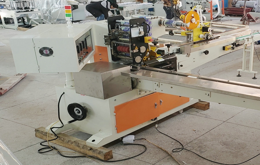 該機(jī)主要適用于標(biāo)準(zhǔn)型紙手帕、迷爾型紙手帕、平整規(guī)格的長方形物體的塑料薄膜包裝。 整機(jī)運行由三菱可編程序控制器(PLC)、大屏幕觸摸屏、主機(jī)采用變頻調(diào)控系統(tǒng),下膜采用步進(jìn)電機(jī)準(zhǔn)確無誤。采用凸輪式傳動,結(jié)構(gòu)緊湊, 操作簡單,維護(hù)方便,撕口機(jī)構(gòu)分為氣動式和滾動式,可供客戶選擇。